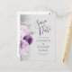 Den här eleganten är modern när du sparar datumet för vykort har en lila- och lavender-blommigt som trimmas med faux silver glitter. Anpassadet kombinerar handskriftsskript för mörk lila med teckentabellen för kol-grått på en silver grått-bakgrund. På baksidan upprepas informationen, tillsammans med en returadress för anpassadet.
