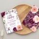 blommigt av budgeten och pumpkindroppinbjudan till babydusch i lila, grönt och persikor. Med vacker vattenfärgsutformning, blommigt, blad och pumpor. Idealisk höst-/höstdesign. Sabel för en könsneutral babydusch.