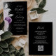 Den lämnat kant i denna elegant är en modern bröllopsinbjudan med en blommigt i lila- och lavender, som trimmas med silver faux foil och faux glitter foliage och sprinklas med silver faux glitter. Anpassadet kombinerar handskriftsskript för blek silver grått, mönsterfärg och kursivt typsnitt mot svart bakgrund. Den omvända sidan ger plats för bröllop-information på en solid svart bakgrund, tillsammans med en QR-kodgäst som kan söka på webbplatsen och OSAN, vilket sparar kostnaderna för utskrift och utskick av separat OSA kort.