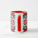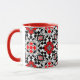 Mugg i en Art Deco Moroccan-ruta mönster baserat på stiliserade blommor och löv - djup kinesisk rött med klassisk svart och vit färg, accentuerad med silver grått / grått