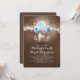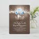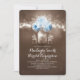 Inbjudan till vintage bröllop innehåller en sträng med ljus som hänger på träd gren och söt lilla mason burk med blommar för turkos ro och baby utandning.