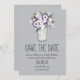 Elegant Mason Burk Spara datum meddelande. En Mason Burk fyllde med blommor i färg av Light och Mörk Lila med vita Daisy vilda blommor. Med Färgaden Silver Grått bakgrunden. Om färg inte är vad du ville, så säg till och jag återskapar det åt dig, men kontakta mig innan du beställer. E-post: paula@labellarue.com Lycklig Bröllop Planning! Se till att du plockor din favoritkartong så att den trycks på.