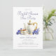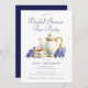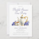 En inbjudan till en tegrupp för blommigt med elegant-vattenfärg, som kan vara personlig när du lägger till information om möhippan. Inbjudan innehåller en tekanna med elegant vattenfärg, kopp och såser omgiven av en vacker arrangemang med blå blommigt. Utformningen är elegant och modern.