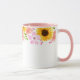 Blommigten mugg har söt sommarblommor av rosa vild ro, korallvallmo och friska solblommor längst upp i kanten om mugg. Exempelhandtag och insida som visas är rosa.