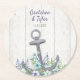 Denna nautiska pappra underlägg har en vattenfärgsankarpunkt som är märkt med blå, lila och vita blommor på grund. Bakgrunden till en västerlös vit träplank fortsätter att vara nautiskt tema. Perfekt för att klä ut bordsartiklar eller pub vid ett nautiskt eller havscentrerat bröllop, möhippa, förlovningsfest, födelsedagsfest, repetitionsmiddag eller årsdag firande. Tillgängligt med matchande produkter.