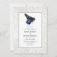 Gothic bröllopsinbjudan med en korv och en snöre-bakgrund med en gyldad marin blå ro harlequin mönster-baksida.