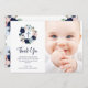 Den här snyggten, den könsneutrala baptismen eller det julande tack som du har fått, har en krans av marinblått, ljusblått och vattenfärgsblommor med grönt- och neutralt beige löv, med en matchande kor i mitten. Ditt baby är synligt på kortet tillsammans med ett handskrivet skript som säger "tack".