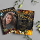 Vacker rostig orange och mörk burgundisk höst faller blommor och pumpar gräns med strängar av guldfärgad ljus över en mörk brun lingbakgrund som skapar en charmerande PHOTO-studentfest med ett trendig handskript guld typografi. +++++++++ Enkel att anpassa med information och bild på båda sidor! Lämplig för traditionell rustik | LAND | Jordbruksföretag | party eller grillytor utomhus.