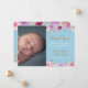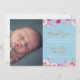 Med ditt baby-foto och dina ömtåliga våtfärgsblommor ovanför och under personligens speciella baby-meddelande tackar du för meddelandet. Den motsatta har en matchande blå bakgrund som kan ändras till färg eller lägga till ytterligare information. Designad av Thisisnotme©