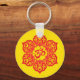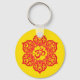 En Aum- eller Om-design finns inuti en stiliserad lotus-blomma. Det cirkulära mönster är en färgad med djup rött som lyfts fram för att skapa en ljussken på yta. Bakgrunden är målad ljus gult som kan ses genom blommans negativa yta. En skugga visas precis under designen och den verkar flyta precis ovanför yta i nyckelkedjan. Denna snyggt är en slående återgivning av andlig-symbolen.