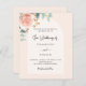 En ro guld-bakgrund med en båge. Dekorerad med en ro guld och rosa blommigt, blomma från ro och vattenfärgad eukalyptus greenergiy från grönt. Anpassa och lägg till namn och information. Bakåt: ro guld, färg. 1 lakan = 1 inbjudan tryckt kant till kant.