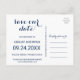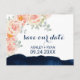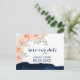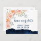 Den här blommigten är persiko-rosa och marin vattenfärg, men datum-vykort är perfekt för ett modernt bröllop. Konstruktionen har en känslig kaskadbukett av rosa och persikoblommor som står i kontrast till bassäng av marinblå vattenfärg.