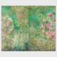 Rundformad blommigt, rosa och gult arrangemang med guld, antika handskriftsöverlägg över en abstrakt, grönt och guld-färg tvättar med initialmallar och namn-mallar i monogram.