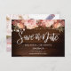 Blommigt rustic bröllop spara datum-kort med en unik baksida av trä och elegant-tvillingsträng ljus med vattenfärgblommor. Den här designen kan ändras beroende på dina inställningar.