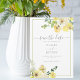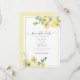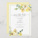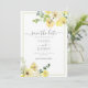 Fintvätt med vattenfärg gula blommor dekorerar den vackra sommareftermiddagen Spara datumkortet. Trädbröllopet inbjudan accentueras med en mjuk grönt gräns och botaniskt löv under eleganten soliga ponnyer. Blommigt och ljus, perfekt för en utomhusceremoni.