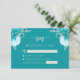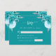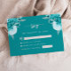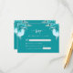Kortet för OSA i elegant bröllop har turkosbuketter som sätts av med silver faux foil greenery i två hörn, på turkobakgrunden. Anpassadet kombinerar silver grått serif och handskriftsformat typsnitt. Den omvända sidan har en matchande turkos och blommigt i silver.