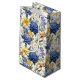 Den här lilla storleka pappra presentpåsen visas i ett vackert blått flerfärg-blommigt. Anpassa den här presentväskan eller köp som det är. Licensierad utskrift