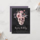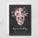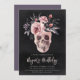 Chicen Halloween födelsedagsfest inbjudan med en blommigt skallillustration som är täckt med blommor av rosa och lila vattenfärg på en rökig svart bakgrund. Anpassa denna unika och elegant Halloween födelsedagsfest inbjudan med din händelseinformation i vit och rökig text.