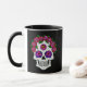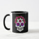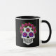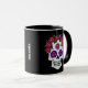 Ett fint kaffe mugg med en blommigt sockerskalle med ro tillsammans med ditt eget namn eller annan text. Perfekt för Halloween älskare och spooky-säsongen.