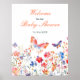 Välkomsttecken för söt möhippa med färgstarka blommor i rosa, lila och orange, fjärilar och löv. Perfekt för en vår- eller sommarmöhippa. Ord kan bytas ut mot kostym för egna uppgifter eller krav.