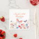Söt födelsedag napkin med färgstarka blommor i rosa, lila och orange, fjärilar och löv. Perfekt för en vår- eller sommarmöhippa. Ord kan bytas ut mot kostym för egna uppgifter eller krav.