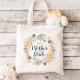 personligen personligt bröllp tote bags med texten budens mamma namn eller annan anpassningsbar. Elegantens femininindesign har en vattenfärgsutandning av blommigten med dammigt blått grått och peachy gula blommor. Använda designen verktyg för att anpassa varje monogram, välj valfri bakgrund färg, redigera typsnitt och färger och lägg till foton för att skapa en typ av påse för dina bröllopsfester.