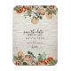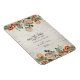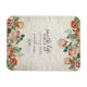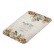 En bröllop spara datum-magnet med en bild av blommor och grönt över överkanten och grund över en vit tegelbakgrund.
