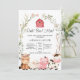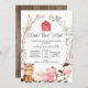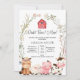 Blommigt Wildblommor Wandesamt Boskap Baby Shower Inbjudan Cute boskap gav en kallelse till babydusch med fyra vattenfärger boskap, en röd lada och en underbar blommigt av vildblommor. Utformningen är rustik i stil och har en träbild på baksidan.