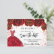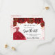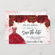 Ett giftigt och trendig Spara datumkortet för en Quinceañera, 15:e födelsedagsfesten. En vit bakgrund dekorerad röd ros, faux guld glitter och en röd klänning. Anpassa och lägg till datum och namn/ålder. Texten: Spara datumet skrivs med ett stort trendig-handskript i stil.