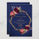 En rustik bröllopsinbjudan till land stil. Ett faux guld geometric ram med vattenfärgade fjädrar och blommigtar i burgundi, rosa och ro guld. Anpassa och lägg till din första information om namn och bröllop. En mörk marin, blå, rustik läggvägg som bakgrund. Golden brev. Baksida: Rustik blå trälada som bakgrund.
