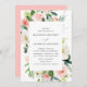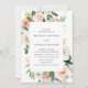 Elegant vår blommigt bröllopsinbjudan med dina namn och bröllop-detaljer som är ramade med vita och vattenfärgblommor och löv för lush grönt. Ett modernt val som är perfekt för vår och sommar-bröllop.