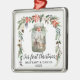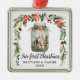 Elegant Calligraphy Script, Vår första julfärgsfärg Winter Blommigt Hjort Ornament innehåller röda poinsettias, vit blommigt ro, gräs, bomulls- och vintergrej. Vattenfärgen Mason burk med hjort och buck i gräs-skogen.