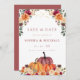 Fall spara datumkortet - vackert vattenfärgskort Hösten Pumpkins Fall Blommigt bröllop spara datum-kort i burguny, orange, grönt och guld punkter.