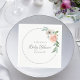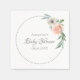 En papper napkin för trendig, enkel och elegant för en babydusch. Dekorerad med en enkel vattenfärgad krans av rons rosa med grönt olivfoliage. Elegantens vita bakgrund. Mallar för mamma till namn och datum. Med texten: Baby Shower skriven med ett handskript i stil. Grått färgad brev. Könsneutralt, för både pojke och flicka.
