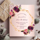 På framsidan: En inbjudan till en 21:a (eller någon annan ålder) födelsedagsfest. En elegant och trendig ro guld faux metallisk tittar bakgrund med ett faux guld geometriskt ram. Dekorerad med mörkens lila och burgundblommor, ro och boho stil fjädrar. Mallar för uppgifter om namn och party. Namn är skrivet med ett handskript stil, lila färgad brev. Baksida: tittar för faux-metaller i ro guld