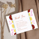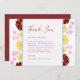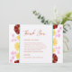 Framsidan visar ett klassiskt tack för elegant bröllop i terracotta som brände orange typografi med en blommigt ram runt den som innehåller burgundi, rosa och gula blommor. Utformningen är färgstark elegant och skildrar glädjen i firande. Det här tackkortet är oerhört unikt och ger definitivt en bild. Tack till gästerna med detta extremt speciella och pulserande kort.
