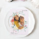Den här söten har en lila Lavender bröllop spara datum-annonsering med färgstarka vattenfärgshärgar och delikata mjuka persikor, elfenbensvita och rosa blommor, med subtila löv av grönt som tillför en mjuk skönhet till denna romantiska design. Ett vackert ljusbildfoto sitter mitten på kortet. Köp den här butiken för att samordna bröllopsinbjudningar.