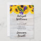 Ett fet svart, handskrivet manusyrgrafi och land-rustiskt vitt trä med gult och lila solrosols blommigt på bakgårdens bröllopsinbjudningar.