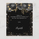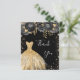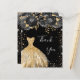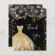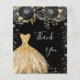 Ett feminin- och elegant födelsedagstack. En svart bakgrund med faux guld glitter, gnistor, svart ro och en gyllene klänning. På framsidan finns ett skript med stora bokstäver och texten: Tack. Tillbaka: Anpassa och lägg till tackkort och namn. Namn är skrivet med ett modernt handskript i stil.