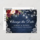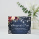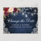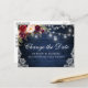 Modern Elegant Watercolor Burgundy Marsala Blommigt Ändra postpostponement Bröllop har burgundy ro, rosa ros och grönt på rundblått trä med mynningen burk ljus och snöre.
