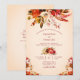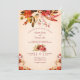 Vattenfärgsfärgad blommigt inslag på vacker höst färger, som är placerad över en mjuk, blåaktig voridduk, avslutat med elegantens kalligrafi av höstens röda skript. Perfekt för både avslappnad- och mer formella bröllop-teman.
