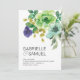 Det här sparar datumkortet med en stor vattenfärgad bukett av teal, kalkgrönt och lila blommor och grönt. Kortets baksida är en samordnande lila färg.