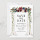 Elegant bröllop Canopy Watercolor Burgundy Marsala Blommigt Bröllop Förlovning Meddelande Spara Datakortet innehåller vackert burgundi ro, rosa ros, rödblommor och blåa blommor. Träets kanopy-båge i bröllop omfattar botaniskt grönt.