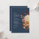 Bröllopsinbjudan till Blommigten för flotta. Den här eleganten och den roliga bröllopsinbjudan innehåller handmålad vattenfärg, bränd orange och terracotta löv, kräm och beige dahlias, och vacker rost-färgad ro på marin blå bakgrund.