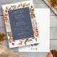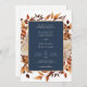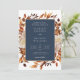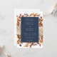 Bröllopsinbjudan till Blommigten för flotta. Den här inbjudan från elegant bröllop innehåller vackra, handmålade vattenfärger, bränd orange och terracotta löv, kräm och beige dahlias, och vacker rost och brunt ro på vit bakgrund, perfekt i höst bröllop! Baksidan av inbjudan har ett vackert gren av löv med briden och brudgummens monogram. Sök efter matchande objekt i Bröllop-samlingen för marinblå höst Romantik.