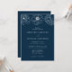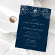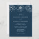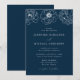 Elegantens bröllopsinbjudningar i blommigten med en gräns av vita blommor med marin bakgrund. Anpassa bröllopsinbjudningarna för marinen med information om namn och bröllop i blommigt med kalligrafi-skript. Designad att samordna med vår Daety Blommigt bröllop samling.