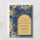 Den här fantastiska bröllopsinbjudan har en marin blå bakgrund med lustiga solblommor och omgiven av ljusblå blomma och grön. Guld-stift och kalligrafi är en perfekt som åtföljer de vackra blommorna. Ett bra designval för att ange tonen för bröllop firande. Det finns kortvariationer och ett matchande kuvert. Om du vill ha en designfråga eller ytterligare anpassning och/eller matchning av objekt kan du skicka ett e-postmeddelande till charmdesignstudio@rcn.com så hjälper vi dig gärna.