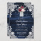 Rustic navy blue, burgundy and blommigt bröllopsinbjudning med en bouquet av ro och baby utandningsblommor i en mason burk mot en lingbakgrund som är försedd med vit blommigt snöre och sträng ljus. Utformning av perfekt för att bjuda in gästerna till din marinblå, burgundära och , roliga bröllopsfest. Anpassa enkelt den här bröllopsinbjudan med din bröllop-online. Fullständig utformning av anpassadet. Matchande objekt är tillgängliga.