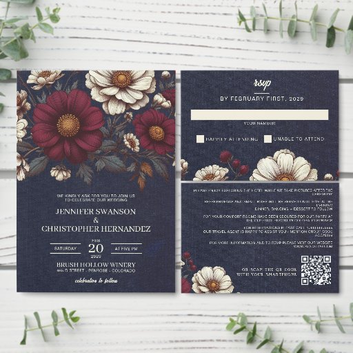 Blommigten Bröllop vid marinblått och burgundy Tilläggskort