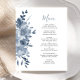 Lämnat kant på den romantiska bröllop-menyn har en blommigt med vattenfärg av dammig blåa blommor och grön. I anpassadet kombineras handskrift, tryckplåt och kursivt typsnitt i grått och dammblått på vit bakgrund. Den omvända sidan är en koordination av fast dammblått.